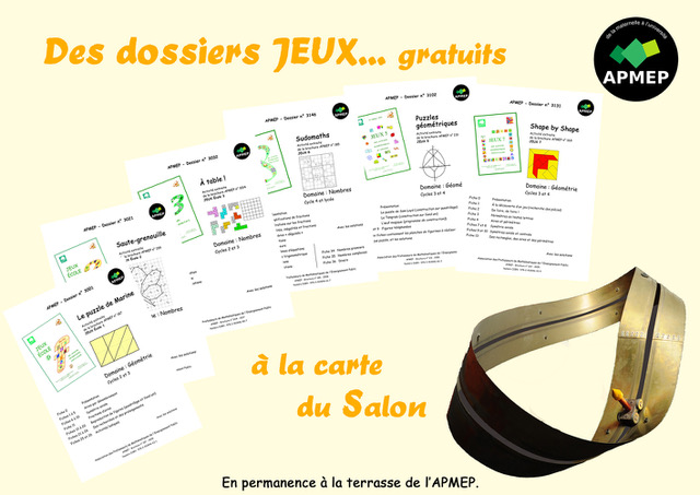 Vous trouverez sur le stand de l’APMEP des jeux distribués dans le commerce ou imaginés par nos soins qui amènent à faire de la géométrie, du calcul et de la logique à tous les niveaux et à résoudre des défis. Vous pourrez découvrir et vous procurer les brochures « JEUX ». Elles proposent des activités utilisables directement en classe. Les parents peuvent s’en emparer pour jouer eux-mêmes avec leurs enfants. Le jeudi et le vendredi des groupes scolaires peuvent s’inscrire, pour jouer, plier, déguster des mathématiques